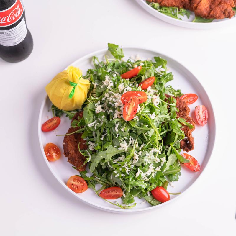 Baby arugula, shredded cheese, cherry tomato, apple cider vinaigrette, lemon squeeze. Choice of sides: waffle fries, house chips, or apple coleslaw