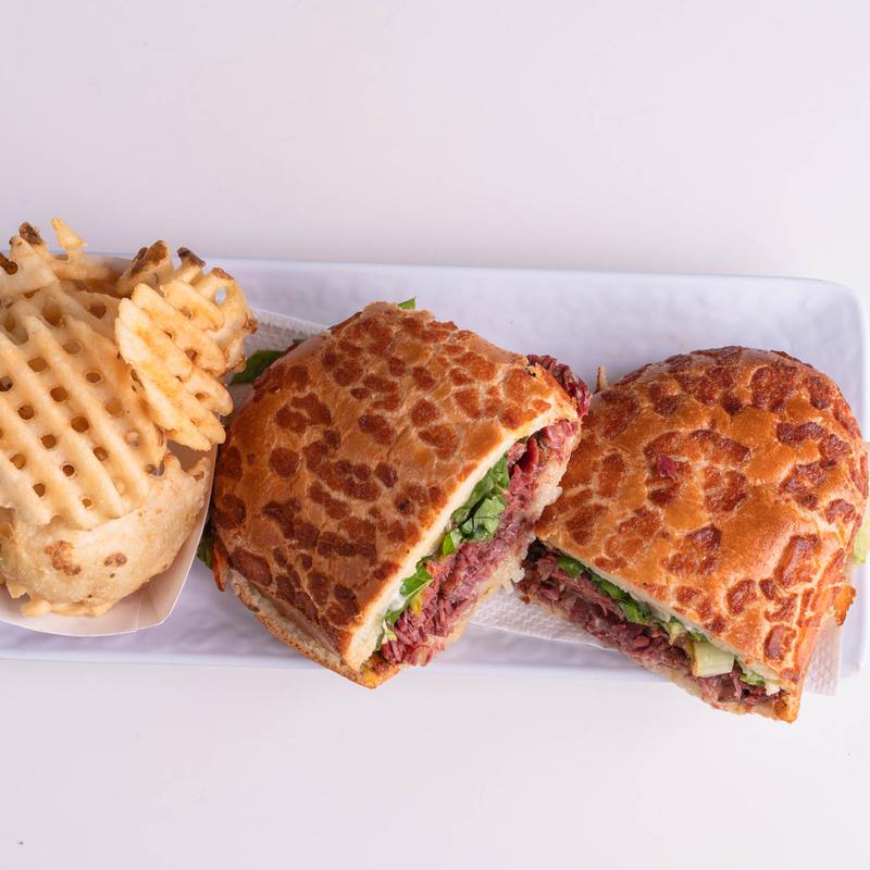 14 Halves $110.00 | 30 Halves $235.00 • Choice of two pastrami sandwich varieties: pastrami, fried chicken, smoked porchetta, pastrami Reuben, or plant-based protein. Bread options: sourdough, marble rye, Texas toast, or Dutch crunch.
