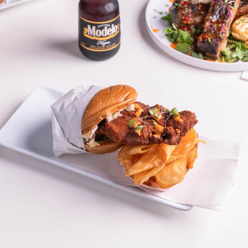 House pickles, apple coleslaw, spicy chipotle aioli, brioche bun. Choice of sides: waffle fries, house chips, or apple coleslaw